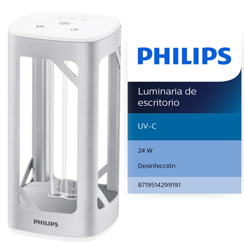 La lámpara de escritorio para desinfección mediante luz UV-C de Philips te permite eliminar con eficacia virus, bacterias, moho y esporas en tan solo minutos. Además el producto incluye sensores integrados y temporizadores que actúa como una medida de protección adicional para ti y el personal.